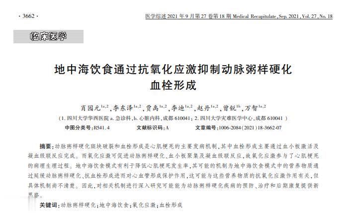 参考文献[1]肖园元.地中海饮食通过抗氧化应激抑制动脉粥样硬化血栓形成, 医学综述, 2021-09-10