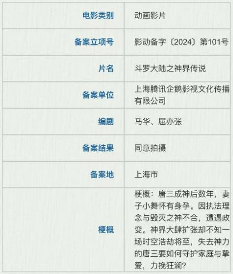 腾讯企鹅影视计划将其IP《斗罗大陆之神界传说》打造成动画电影,早已备案立项。