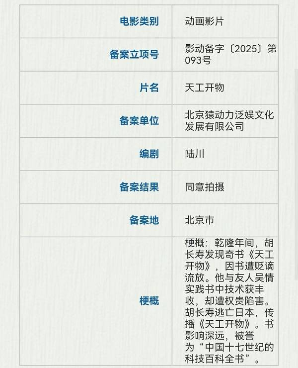 名导演陆川也有做动画电影的计划,他的公司北京猿动力泛娱文化备案了由他编剧的《天工开物》,讲的是乾隆年间,胡长寿发现、实践并传播奇书《天工开物》的故事。