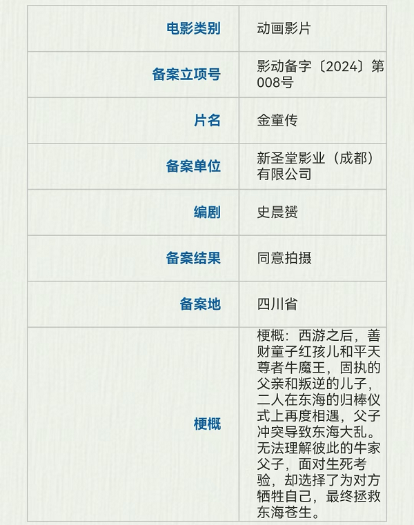 另外,华谊控股的《前任》系列导演田羽生的公司新圣堂影业备案了动画电影《金童传》,讲的是善财童子红孩儿和平天尊者牛魔王这对固执的父亲和叛逆的儿子的故事。