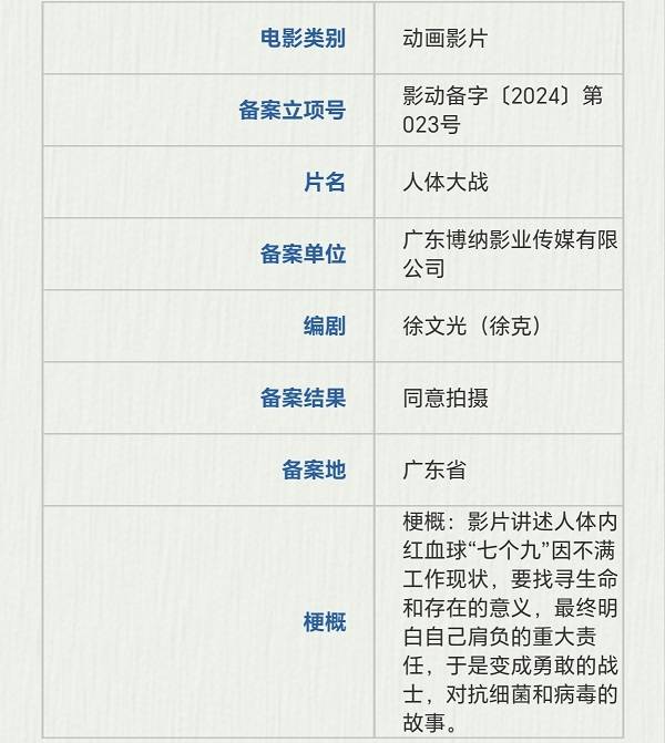 《人体大战》由多次和博纳合作的徐克编剧,他很可能任导演。影片以人体内红血球"七个九"为主角,讲述其因对工作现状不满而探寻生命意义,最终觉醒责任意识并投身对抗细菌病毒的战斗历程。