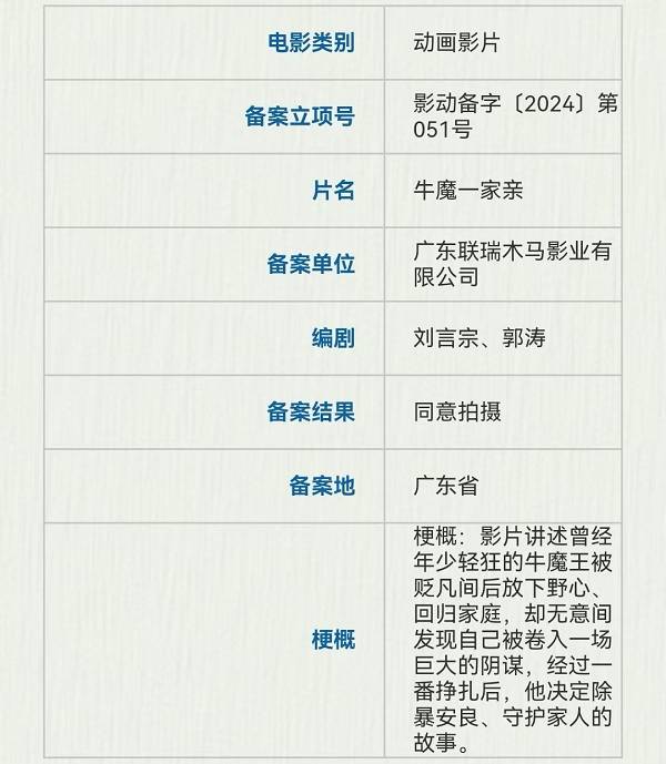 广东联瑞木马影业备案了以牛魔王为主角的动画电影《牛魔一家亲》。