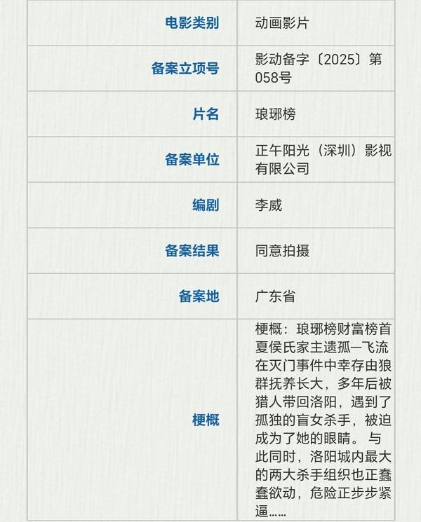 正午阳光计划将其IP《琅琊榜》打造成动画电影,也已备案立项。
