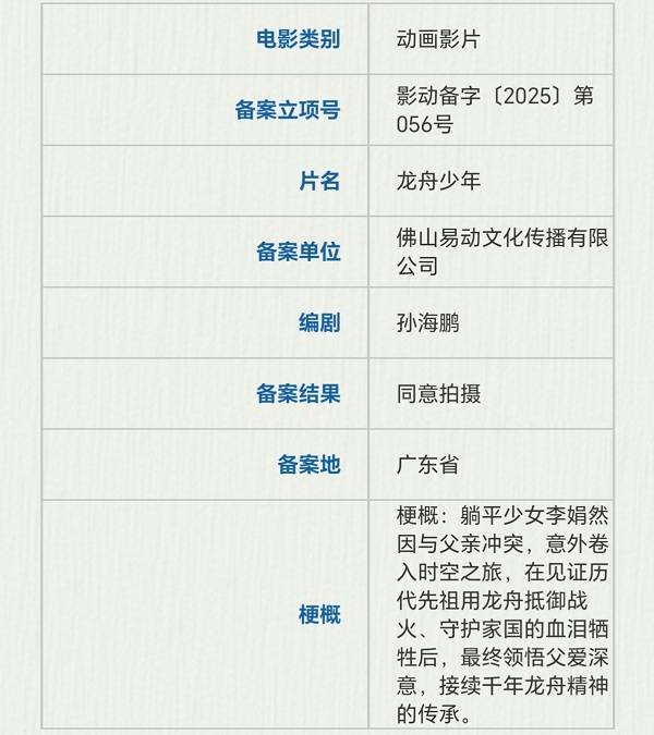 《雄狮少年》导演孙海鹏的佛山易动文化传播备案了《龙舟少年》,讲的是躺平少女李娟然因与父亲冲突,意外卷入时空之旅,在见证历代先祖用龙舟抵御战火、守护家国的血泪牺牲后,最终领悟父爱深意,接续千年龙舟精神的传承。