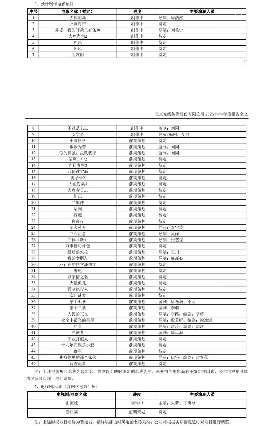 光线的近三年计划是《去你的岛》2026年上映,《罗刹海市》《外婆,我的耳朵里有条鱼》《朔风》《茶啊二中2》2027年上映,《涿鹿》《大鱼海棠2》《二郎神》《妲己》2028年上映。