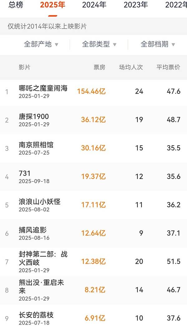 年度票房榜前十部电影中,动画电影占了三部,这是历年来的最高数量,分别是排在第一的《哪吒2》,排在第五的《浪浪山小妖怪》,排在第八的《熊出没·重启未来》,动画电影票房占比创了历史新高。