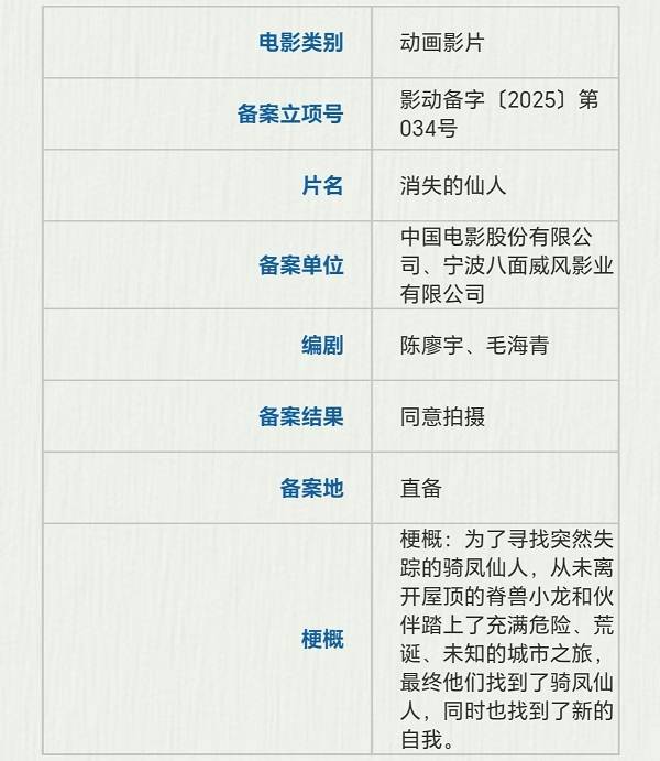 中国电影之前和华纳兄弟合作推出过动画电影《猫和老鼠:星盘奇缘》。今年,中国电影和宁波八面威风影业共同备案了动画电影《消失的仙人》,讲的是脊兽小龙和伙伴寻找突然失踪的骑凤仙人的故事。