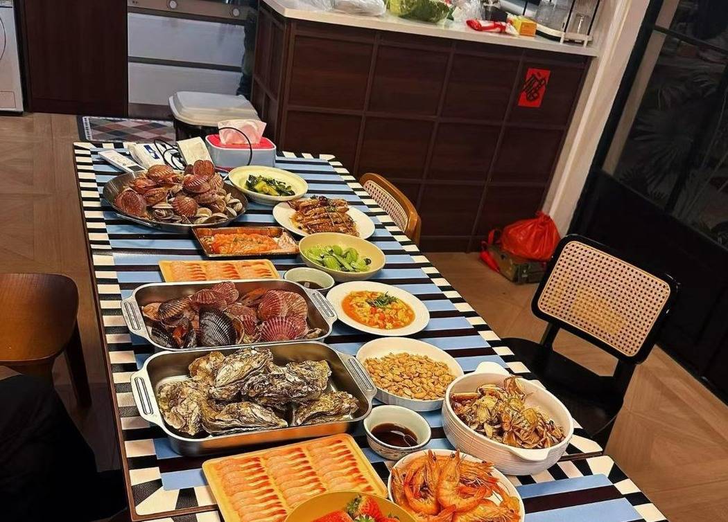 这份舒服和安逸,也藏在一餐一饭的烟火气中。2月13日,吴秀婷一家人抵达民宿后,先在海边漫步赏景,待到夕阳西下,便踏着落日余晖,漫步至邻近的张家台码头,恰好遇上出海归来的渔船,新鲜的螃蟹张牙舞爪。吴秀婷一家当即买了一筐,又驱车前往石臼海鲜市场,精心挑选了各色海货,亲手凑齐了一桌地道鲜香的“渔家年味宴”。