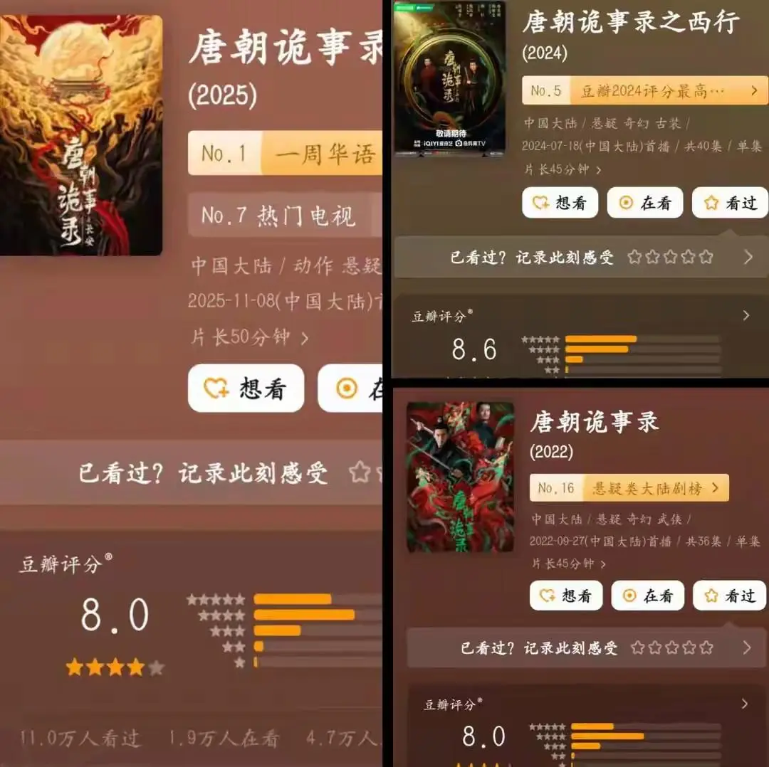 作为国产古装悬疑IP的“标杆之作”,《唐朝诡事录》系列自2022年开播以来,凭借诡谲案件、精良制作和鲜明角色圈粉无数,前三季累计播放量超70亿,豆瓣评分均稳定在8分以上,其中第三季《长安》以8.3分收官,成为年度口碑爆款。