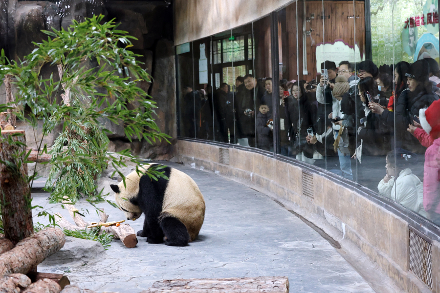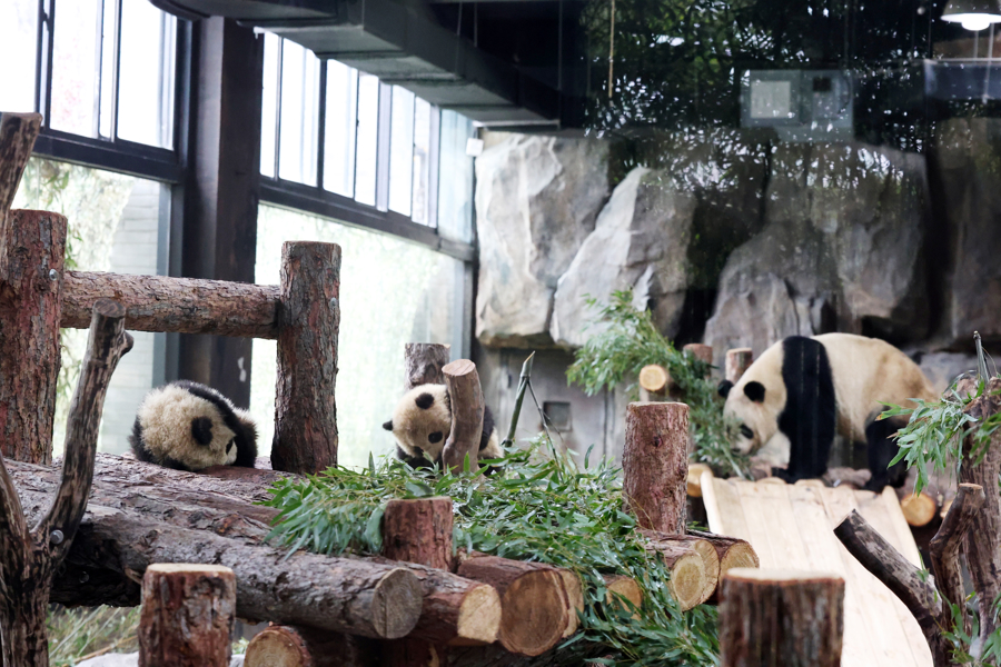 昨天上午,记者提前进入大熊猫母幼展区探访,大熊猫妈妈“芊金”正悠闲啃食竹子,姐姐“芊然”活泼好动,在栖架上灵活攀爬,显得格外调皮,弟弟“芊逸”在一旁安静酣睡,憨态可掬,引得在场游客纷纷拍照记录。